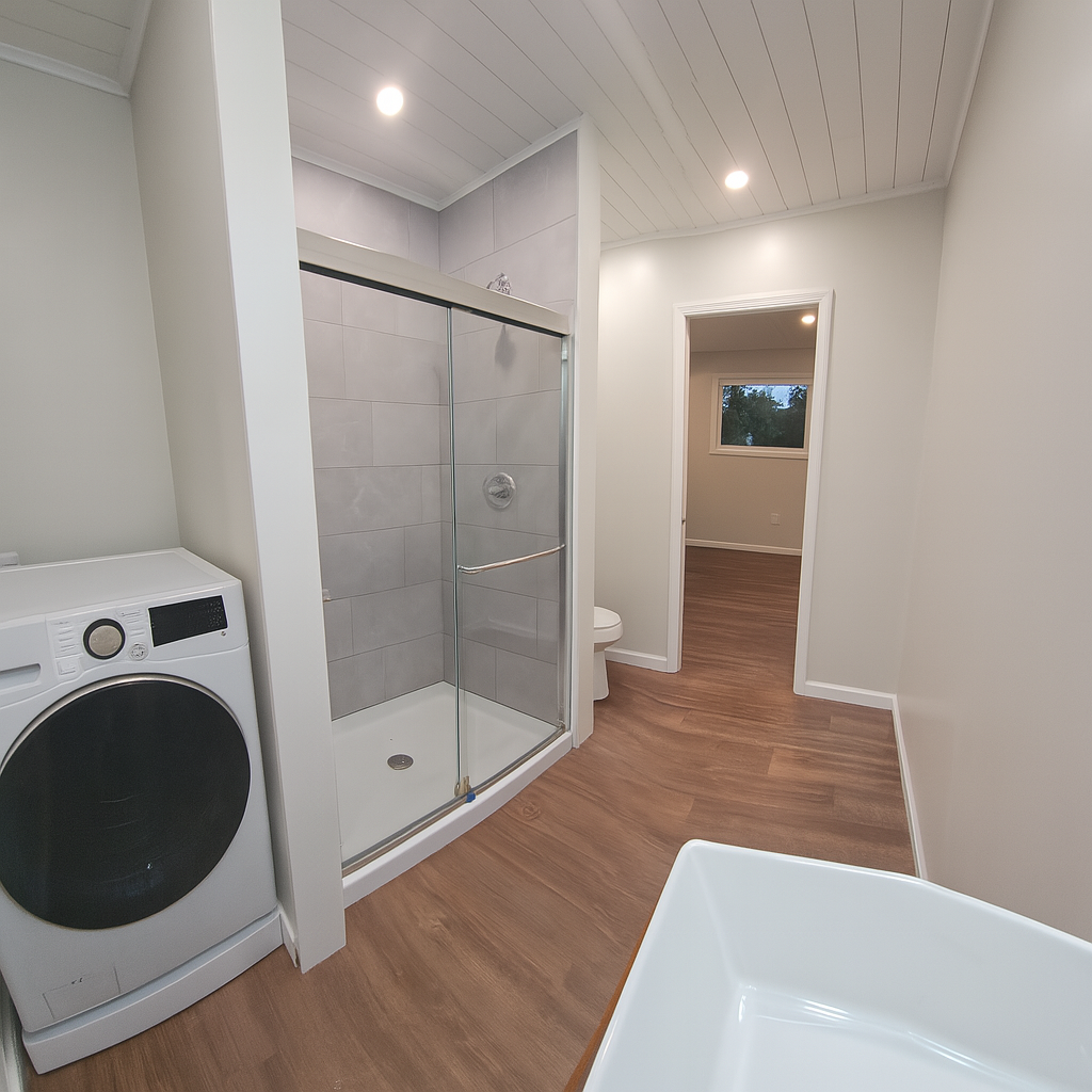 A spacious bathroom features a beautiful shower with glass doors, toilet, vanity, and the room provides space for a laundry machine.